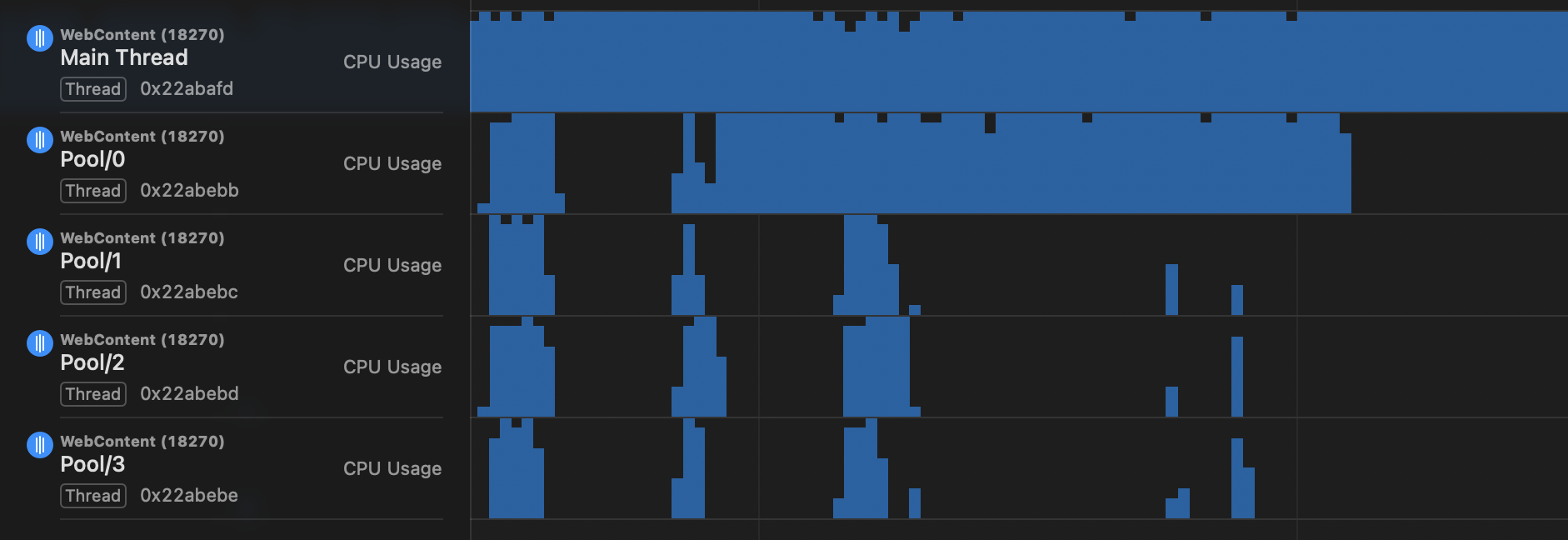 The parser now runs on worker threads (#8211). When the HTML parser encounters a <script> tag, it dispatches parsing to a thread pool and only performs bytecode generation on the main thread. Since the parser is written in safe Rust, parallelizing it was straightforward. Here’s a profile of x.com loading: the main thread carries on executing JavaScript while four background threads parse downloaded scripts in parallel.